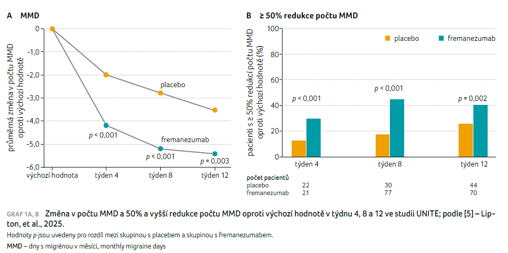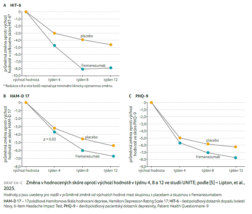 Studie UNITE proběhla mezi červencem 2020 a srpnem 2022. Do hodnocení bylo zahrnuto 353 pacientů s průměrným věkem 42,9 roku (směrodatná odchylka 12,3 roku), z toho 310 (88 %) bylo žen, 43 (12 %) mužů; 48 % osob trpělo epizodickou a 52 % chronickou migrénou. Pacienti byli randomizováni do skupiny s měsíčním podáváním fremanezumabu (n = 175) nebo do skupiny s placebem (n = 178). Celkem 164 ze 175 (94 %) pacientů ve skupině s fremanezumabem a 166 ze 178 (93 %) pacientů ve skupině s placebem dokončilo dvojitě zaslepené období a vstoupilo do otevřené léčebné fáze (placebo‑fremanezumab, n = 165; fremanezumab‑fremanezumab, n = 165). Přibližně 76 % (268 z 353) pacientů již dříve užívalo léky k léčbě deprese a přibližně 64 % (225) pacientů užívalo pouze jeden lék k léčbě deprese ve stabilní dávce. Průměrná (standardní chyba, SE) změna od výchozího stavu v počtu MMD v průběhu 12týdenního dvojitě zaslepeného období byla −5,1 (0,50; 95% interval spolehlivosti [CI] −6,09 až −4,13) pro fremanezumab a −2,9 (0,49; 95% CI −3,89 až −1,96) pro placebo (p < 0,001), graf 1A [5]. Ve 12. týdnu dosáhlo 40 % (70 ze 175) pacientů ve skupině s fremanezumabem 50% nebo většího snížení počtu MMD ve srovnání s 25 % (44 ze 178) pacientů ve skupině s placebem (95% CI 1,33–3,38). Míra odpovědi na léčbu byla udržena od čtvrtého do 12. týdne (graf 1B) [5]. Průměrné (standardní odchylka, SD) výchozí skóre HIT‑6 bylo 66,0 (4,8) ve skupině s fremanezumabem a 65,4 (4,1) ve skupině s placebem. Ve 12. týdnu byla průměrná (SE) změna skóre HIT‑6 od výchozího stavu −8,8 (0,73; 95% CI −10,20 až −7,34) pro fremanezumab, což ukazuje na klinicky významnou odpověď, a −5,2 (0,71; 95% CI −6,62 až −3,81) pro placebo (rozdíl průměru nejmenších čtverců [LS] − SE: −3,6 [0,81]; 95% CI −5,14 až −1,96), graf 2A [5]. Průměrná (SE) změna skóre HAM‑D 17, která od výchozího stavu nastala do osmého týdne, byla −6,0 (0,55; 95% CI −7,10 až −4,95) pro fremanezumab a −4,6 (0,54; 95% CI −5,66 až −3,55) pro placebo (rozdíl průměru LS − SE: −1,4 [0,61]; 95% CI −2,61 až −0,22; p = 0,02), graf 2B [5]. Výchozí průměrné (SD) skóre PHQ‑9 bylo 15,8 (3,8) pro fremanezumab a 15,2 (3,7) pro placebo. Obě léčebné skupiny prokázaly klinicky významnou změnu oproti výchozímu stavu ve skóre PHQ‑9 v každém časovém bodě (graf 2C) [5]. Nežádoucí účinky byly shodné s jinými studiemi s fremanezumabem.