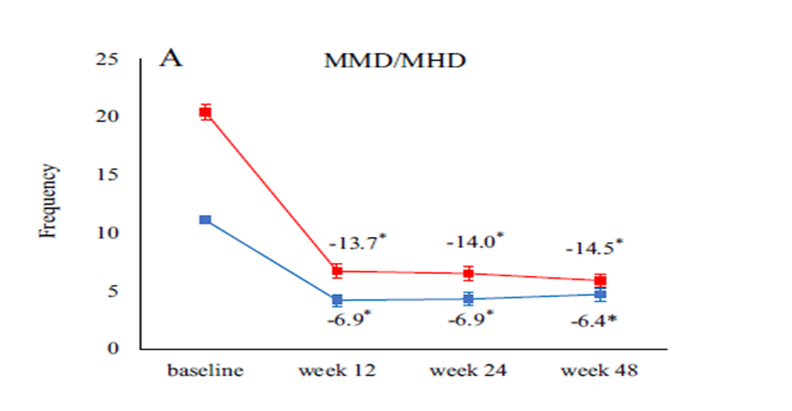 Průměrná změna v počtu dnů s migrénou/bolestí hlavy za měsíc (MMD/MHD); chronická migréna – červeně; epizodická vysokofrekventní migréna – modře (převzato z Barbanti, 2024).